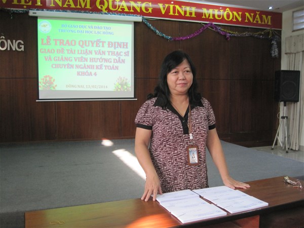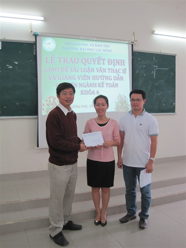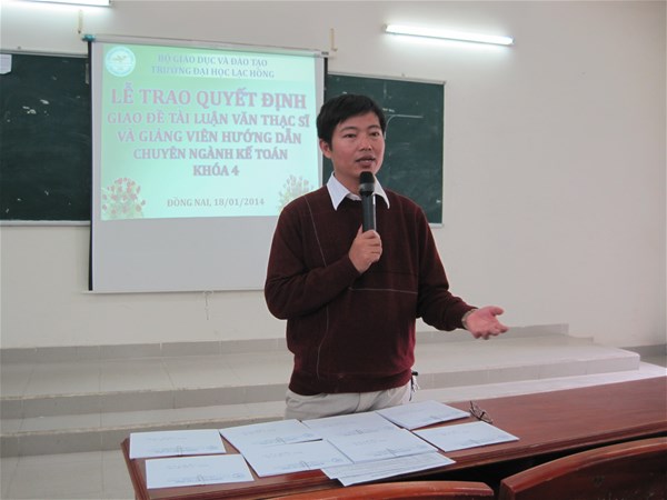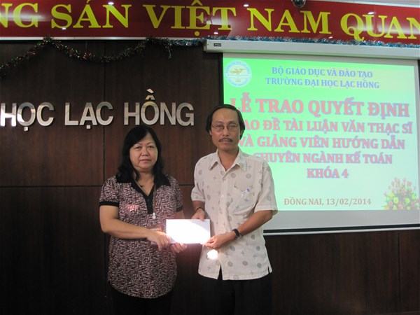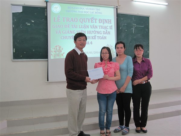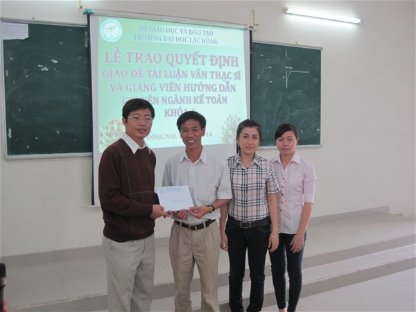 Căn cứ kết quả đánh giá của hội đồng từ buổi định hướng đề tài, vào ngày 18/01/2013 và ngày 13/02/2014, tại phòng B203, Trường Đại học Lạc Hồng đã tổ chức Lễ trao quyết định giao đề tài luận văn thạc sĩ cho các học viên ngành Kế toán khóa 4 năm 2012 đã có kết quả đạt từ buổi định hướng. TS. Nguyễn Văn Tân - Trưởng phòng Sau đại học, kiêm Trưởng khoa Quản trị - Kinh tế quốc tế và ThS. Lê Thu Thủy - Phó trưởng phòng Sau đại học đã thay mặt Nhà trường trao quyết định giao đề tài cho các học viên nói trên.