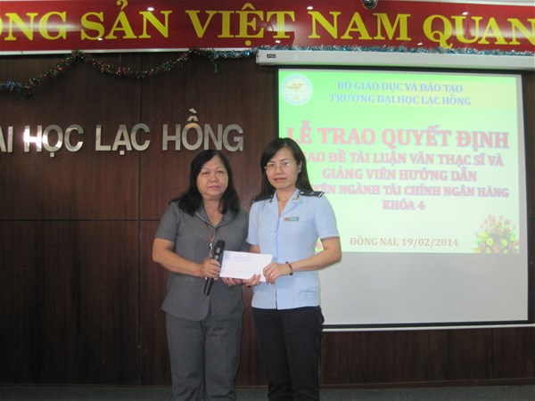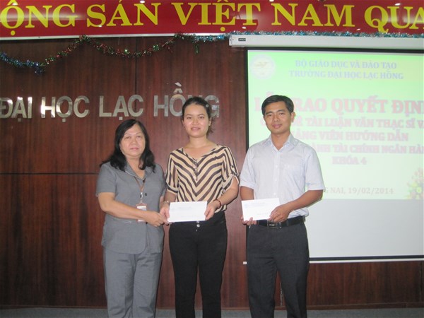 Căn cứ kết quả đánh giá của hội đồng từ buổi định hướng đề tài, vào ngày 19/02/2014, tại phòng B203, Trường Đại học Lạc Hồng đã tổ chức Lễ trao quyết định giao đề tài luận văn thạc sĩ cho các học viên ngành Tài chính ngân hàng khóa 4 năm 2012 đã có kết quả đạt từ buổi định hướng. ThS. Lê Thu Thủy - Phó trưởng phòng Sau đại học đã thay mặt Nhà trường trao quyết định giao đề tài cho các học viên nói trên.