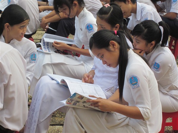 Các học sinh chăm chú theo dõi thông tin tuyển sinh của Trường Đại học Lạc Hồng