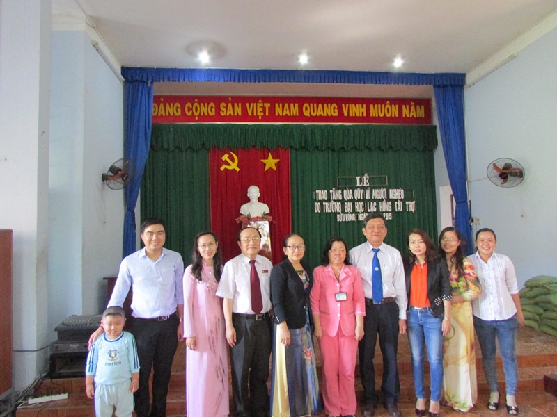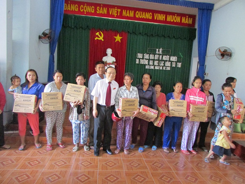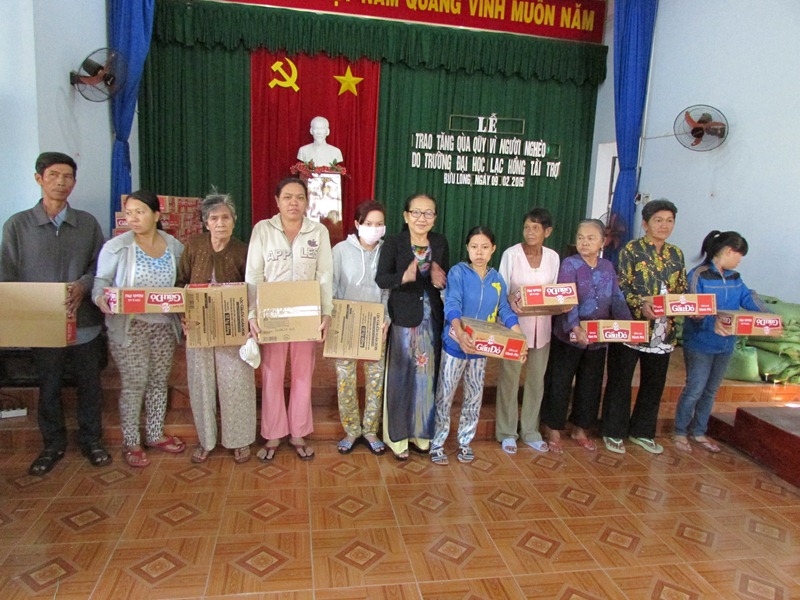 Với truyền thống tương thân tương ái, lá lành đùm lá rách, động viên, chia sẻ, chăm lo cho người nghèo có hoàn cảnh khó khăn,giúp họ có điều kiện đón Tết nguyên đán Ất Mùi 2015, ngày 9/2/2015 vừa qua BCH Công đoàn trường Đại học Lạc Hồng đã phối hợp với Ủy ban Mặt trận Tổ quốc phường Bửu Long, thành phố Biên Hòa, tỉnh Đồng Nai trao tặng 150 phần quà cho các hộ nghèo trên địa bàn phường, tổng giá trị các phần quà là 30.000.000 đồng do toàn thể Công đoàn viên trong trường cùng chung tay đóng góp. Món quà tuy nhỏ nhưng chứa đựng ý nghĩa nhân văn cao cả  của tập thể sư phạm nhà trường hướng tới những hoàn cảnh khó khăn cần sự giúp đỡ. Và đây cũng là một hoạt động thiết thực diễn ra thường xuyên tại trường Đại học Lạc Hồng.