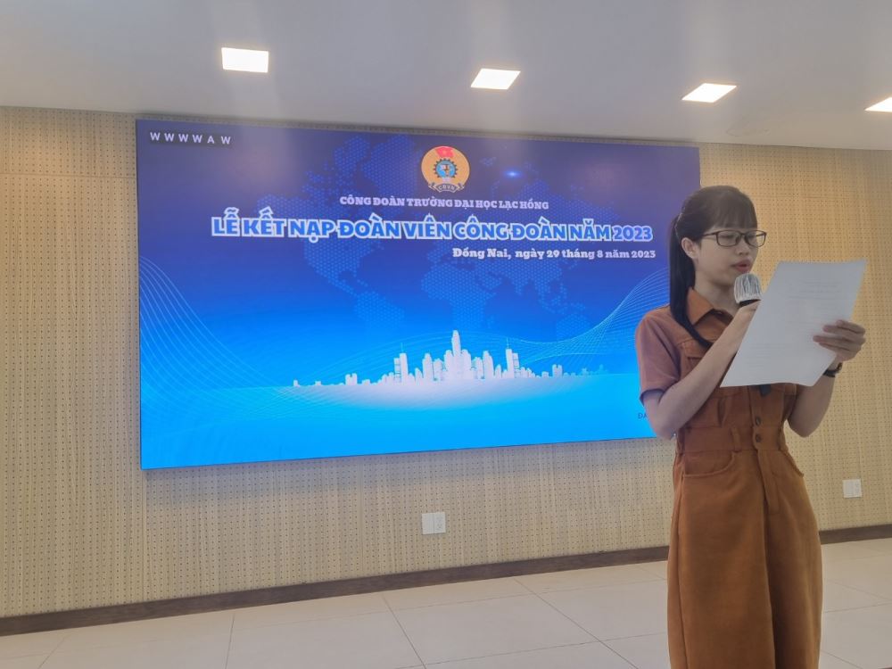 Sau khi vinh dự nhận quyết định kết nạp từ BCH Công đoàn Trường Đại học Lạc Hồng, đ/c Phạm Thị Ngọc Trinh – đoàn viên Công đoàn Tổ Đông Phương đã đại diện cho 16 đồng chí công đoàn viên mới gửi lời cảm ơn tới Nhà trường, BCH Công đoàn Trường Đại học Lạc Hồng và hứa sẽ không quản ngại khó khăn, hết mình với công việc của Công đoàn và của Nhà trường.