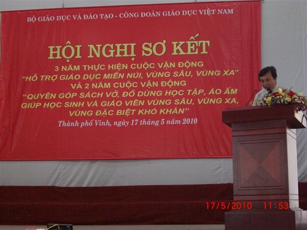 Trong hai ngày 17 và 18 tháng 5 năm 2010 tại TP Vinh Tỉnh Nghệ An , Bộ Giáo dục và Đào tại phối hợp cùng Công đoàn ngành Giáo dục , tổ chức Tổng kết và Sơ kết 4 cuộc vận động lớn trong ngành . Đại diện Trường Đại Học Lạc Hồng , Thầy Hiệu Trưởng Trần Hành và Thầy Chủ tịch Công đoàn Diệp Cẩm Thu về dự.