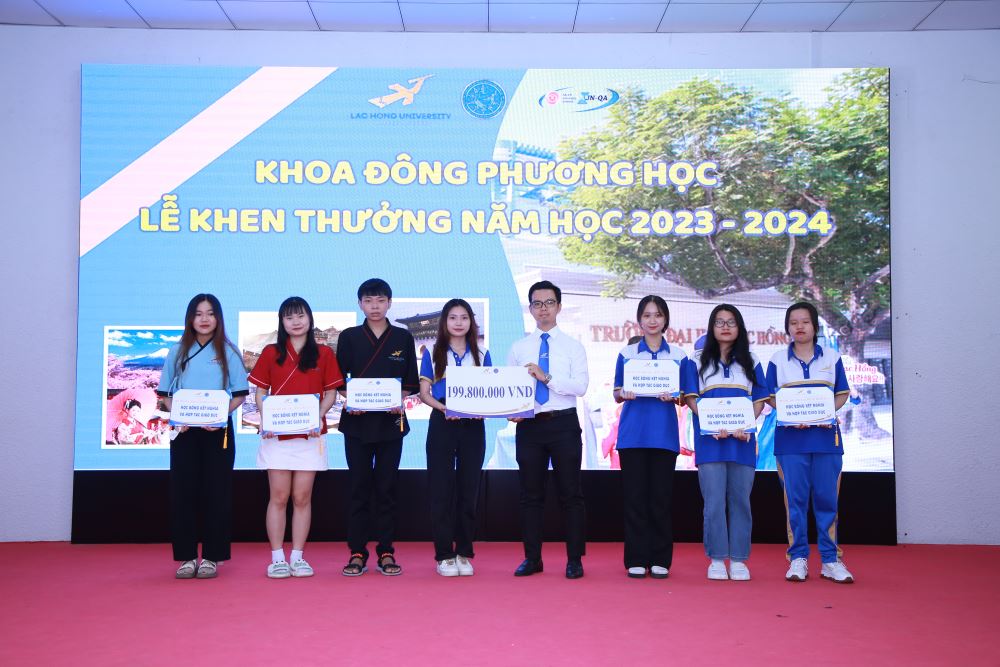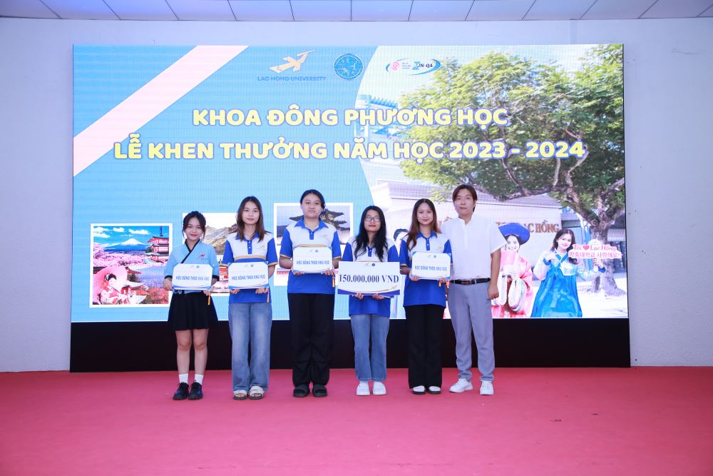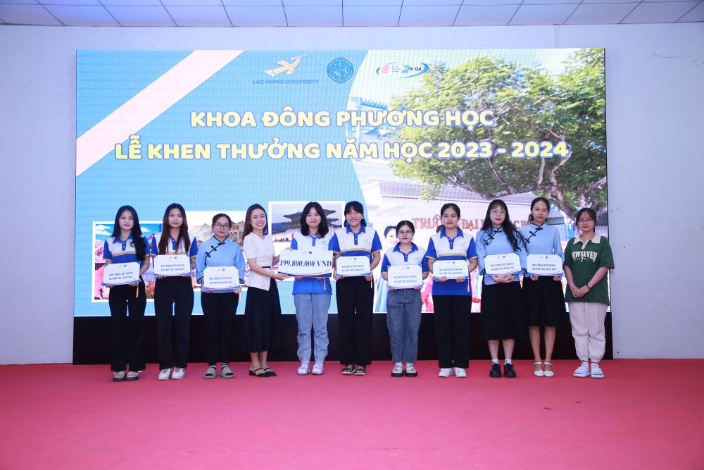 Tại buổi lễ, Khoa đã khen thưởng 28 cá nhân và tập thể sinh viên các ngành đã đạt giải tại các cuộc thi như cuộc thi Hùng biện, cuộc thi Sắc màu Phương Đông tỉnh Đồng Nai, Nhịp cầu Hán Ngữ… Bên cạnh đó, năm học 2023-2024, Trường Đại học Lạc Hồng đã tặng cho khoa Đông Phương 165 suất học bổng dành cho sinh viên các khóa 20, 21, 22 như: học bổng hiếu học; học bổng kết nghĩa và hợp tác giáo dục; học bổng khoa học công nghệ; học bổng theo khu vực; học bổng thủ khoa; học bổng thủ lĩnh thanh niên, cán sự lớp...