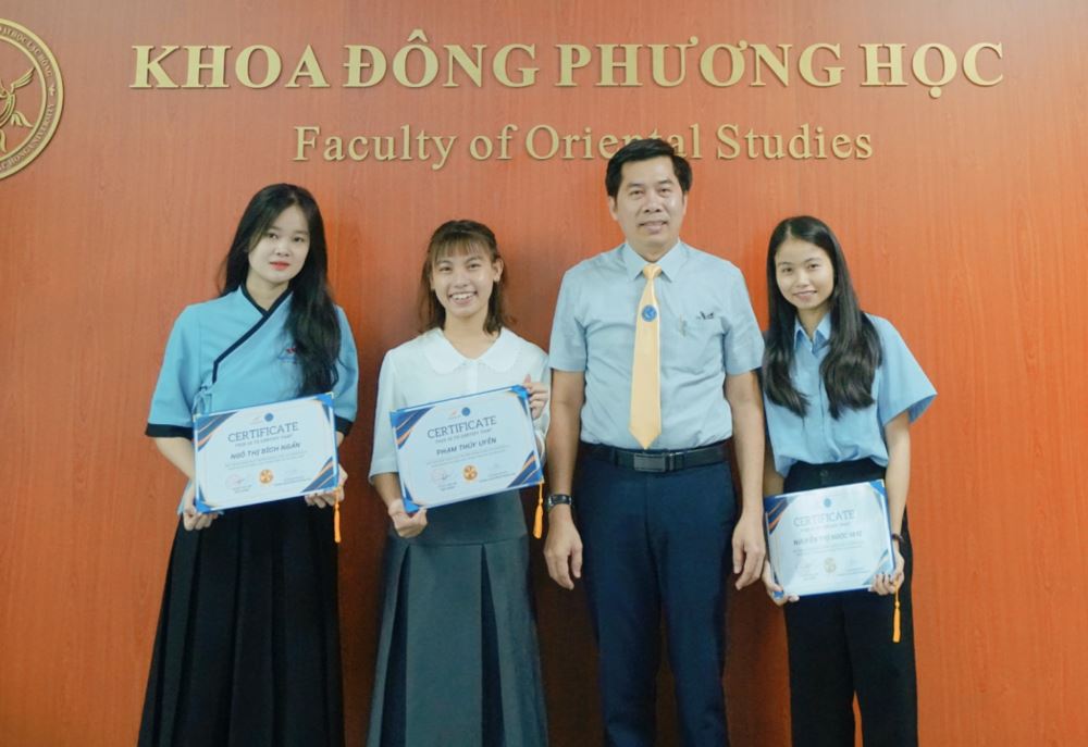 TS. Nguyễn Hữu Nghị - Trưởng Khoa Đông Phương học trao giải cho các sinh viên
