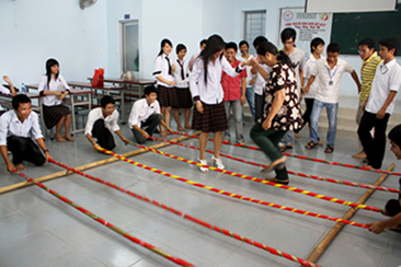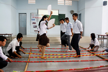 Tạm biệt Đồng Nai, các bạn lớp 08VN111 tiếp tục cuộc hành trình đưa khán giả đến với vùng Tây Bắc thơ mộng, trữ tình, hòa mình vào những điệu múa sạp đặc sắc của dân tộc Thái. Những cây tre được dán giấy màu sặc sỡ lần lượt được đặt đúng vị trí của nó để tạo thành một bộ sạp. Các bạn sinh viên duyên dáng trong những động tác múa bằng những cây tre, thành thục trong từng bước nhảy theo tiếng đập sạp liên hồi, tạo âm thanh sôi nổi. Sau phần minh họa cho bài thuyết minh về trò chơi “Múa sạp”, các bạn lớp 08VN111 đã mời khán giả lên nhảy sạp có thưởng. Nhiệt tình tham gia, nhiều khán giả nhảy rất đẹp, và đẹp hơn cả là phần trình diễn của cô Trương Thị Hoàng Mai. Không khí của buổi sinh hoạt cứ thế nóng dần lên, tiếng đập sạp cũng ngày càng mạnh hơn, khán giả nhảy hăng say hơn...