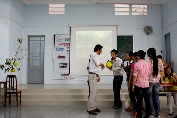 Các bạn sinh viên lớp 09VN111 đã thể hiện khả năng xây dựng chương trình và năng khiếu diễn xuất của mình qua bài thuyết minh “Làng bưởi Tân Triều” một cách sinh động. Cô hướng dẫn viên Thu Tâm đã “dẫn” khán giả tham quan làng bưởi của bác Năm Huệ, giới thiệu nhiều giống bưởi khác nhau, đưa ra nhiều tình huống để lồng ghép nội dung về cách nhận diện bưởi xanh và bưởi chín, cách trồng bưởi như thế nào... Thú vị nhất là phần thưởng thức từng múi bưởi ngọt thanh, vị giòn giòn của nem bưởi và ấm lòng trong hơi men của nước ép bưởi cùng rượu bưởi.
