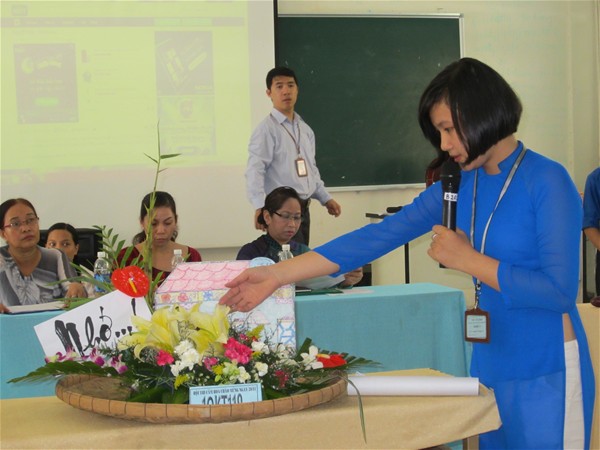 Cô Hồ Thị Hải Yến trao phần thưởng cho 3 đội đạt giải khuyến khích: 09KT117, 10KT112, 11KT311
