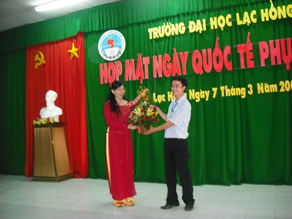 Đại diện tổ Công đoàn Khoa tặng hoa cho công đoàn trường nhân ngày 8-3