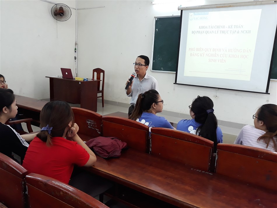 Nhằm có định hướng về đề tài, cũng như nhìn nhận đúng về nghiên cứu khoa học sinh viên trong quá trình thực tập. Do đó, Ban lãnh đạo Khoa Tài chính - Kế toán luôn quan tâm và tạo điều kiện tốt nhất nhằm giúp cho sinh viên có cơ hội cọ sát với thực tế, gắn kết những lý thuyết đã học trên giảng đường với môi trường thực tiễn bên ngoài. Khoa Tài chính - Kế toán đã tổ chức triển khai chương trình nghiên cứu khoa học đối với sinh viên khóa 2015 ngày. Đến tham dự chương trình có các Thầy Cô giảng viên Khoa.