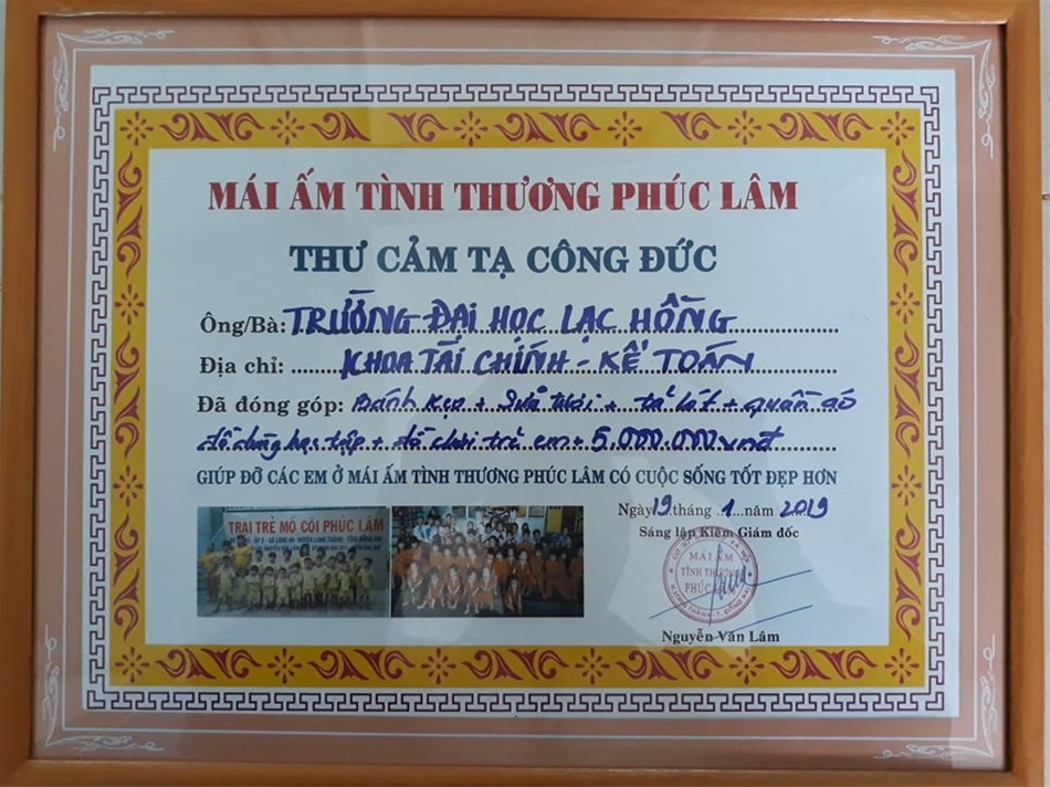 Sáng ngày 18/01/2019, CLB từ thiện Khoa Tài chính - Kế toán, trường Đại học Lạc Hồng tổ chức chuyến công tác xã hội tại Mái ấm tình thương Phúc Lâm (Địa chỉ: 16A1, Ấp 2, xã Long An, Huyện Long Thành, Tỉnh Đồng Nai). CLB đã thay mặt các nhà hảo tâm, các mạnh thường quân gửi tới Mái ấm số tiền 5 triệu đồng và các vật phẩm khác như: sữa tươi, bánh kẹo, tả lót, quần áo, đồ dùng học tập và đồ chơi trẻ em.