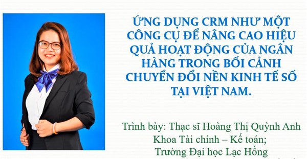 Trong hội thảo, giảng viên Thạc sĩ Hoàng Thị Quỳnh Anh, Khoa Tài chính – Kế toán đã có bài tham luận chia sẻ nội dung “Ứng dụng CRM như một công cụ để nâng cao hiệu quả hoạt động của ngân hàng trong bối cảnh chuyển đổi nền kinh tế số tại Việt Nam.”. Bài tham luận đã nhận được nhiều sự quan tâm và được các đại biểu tham dự đặt câu hỏi trao đổi.