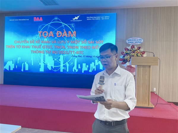 Chiều ngày 15 tháng 10 năm 2022, A301, Cơ sở 1, Đại học Lạc Hồng, Khoa Tài chính – Kế toán phối hợp Hội Kế toán tỉnh Đồng Nai tổ chức “Tọa đàm chuyên đề kê khai và lưu ý một số sai sót trên tờ khai thuế GTGT, TNCN, TNDN theo biểu mẫu Thông tư 80/2021/TT-BTC’.