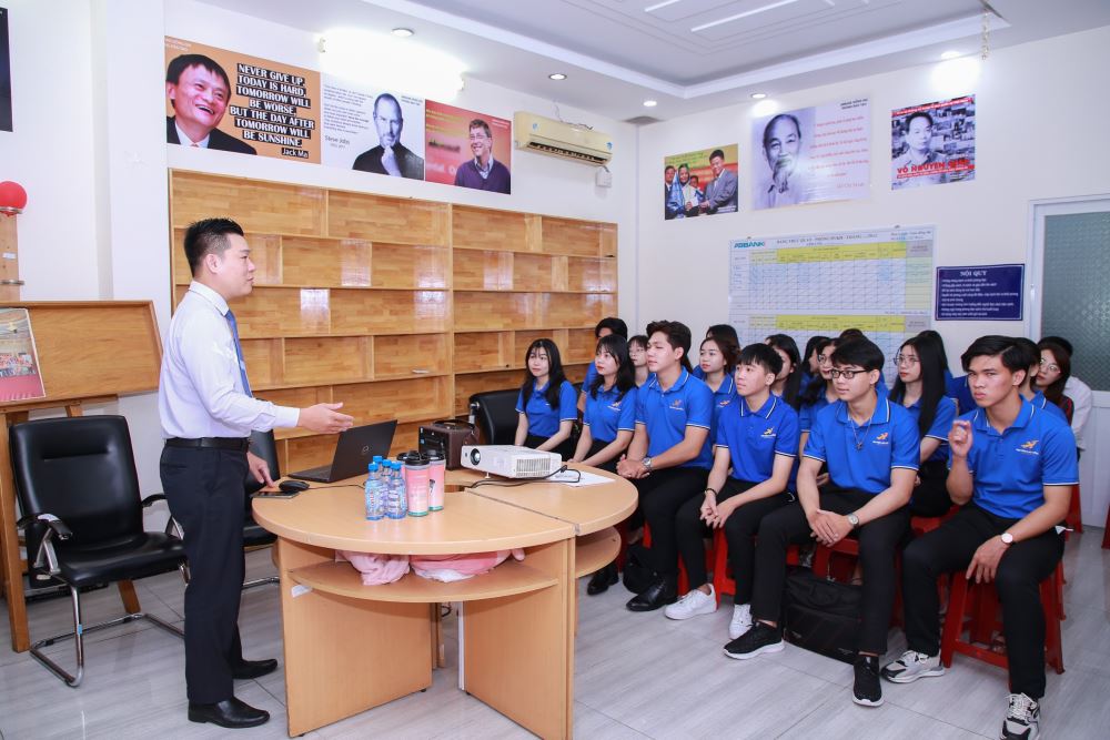 Sinh viên tập trung theo dõi anh chị nhân viên chia sẻ tình huống thực tế