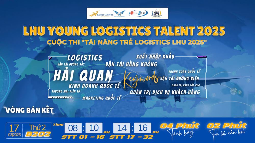 Ngày 17/03/2025, tại phòng B202, Đại học Lạc Hồng, vòng Bán kết cuộc thi "Tài năng trẻ Logistics LHU 2025" đã diễn ra đầy kịch tính, quy tụ 32 thí sinh xuất sắc nhất. Đây không chỉ là một sân chơi học thuật bổ ích mà còn là cơ hội để sinh viên thử sức, nâng cao kiến thức và rèn luyện kỹ năng trong các lĩnh vực Logistics, Xuất nhập khẩu, Hải quan, Kinh doanh quốc tế, Thương mại điện tử, Quản trị dịch vụ khách hàng cùng nhiều chuyên ngành liên quan.