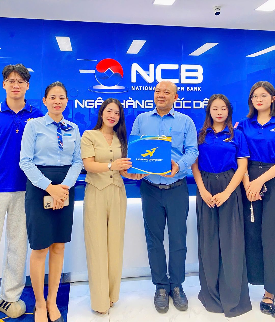 Đại diện Trường Đại học Lạc Hồng đã gửi lời cảm ơn và tặng quà lưu niệm cho Ngân hàng TMCP Quốc Dân – CN Biên Hòa, thể hiện sự hợp tác và gắn kết giữa nhà trường và doanh nghiệp trong công tác đào tạo nguồn nhân lực chất lượng cao cho ngành Tài chính – Ngân hàng.