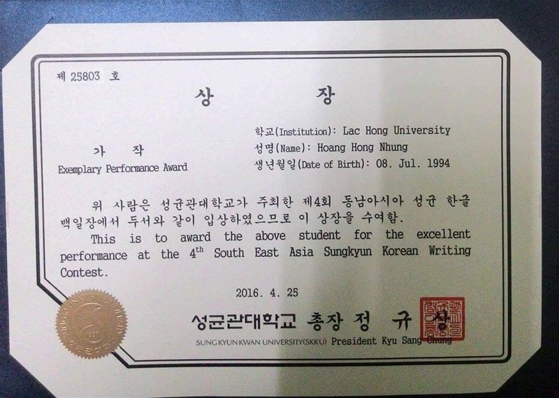 Sinh viên ngành Hàn Quốc học đạt giải Khuyến khích Cuộc thi Viết tiếng Hàn Sung Kyun Kwan KV ĐNA