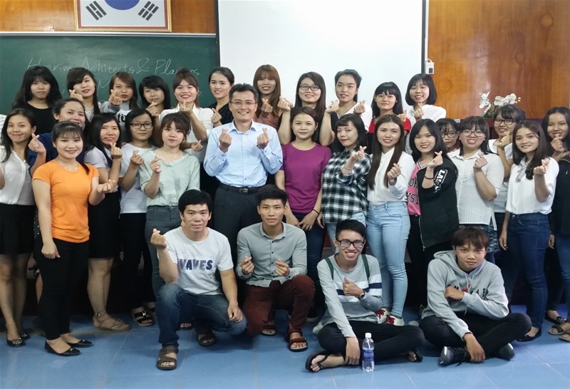 Hình 4: Sinh viên ngành Hàn chụp hình lưu niệm với chuyên gia Hàn Quốc