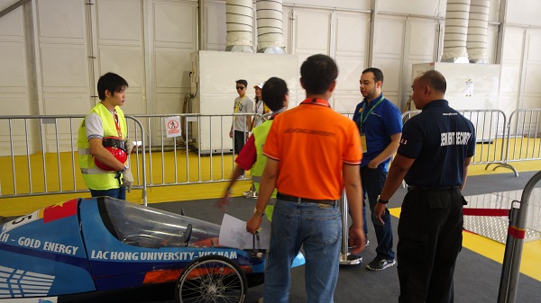 • Kiểm tra seatbelt: lần thứ nhất không đạt yêu cầu (vì không tìm được linh kiện phù hợp nên phải sử dụng seatbelt 5 điểm). Bí thế, đội lại thử mượn linh kiện của đội bạn và nhận được sự giúp đỡ. Sau khi thay linh kiện, xe được đưa vào kiểm tra lần thứ 2, rất tiếc kết quả vẫn không đạt. Cả đội xin phép hẹn hôm sau sẽ test lại phần seatbelt và đã được BTC chấp thuận.