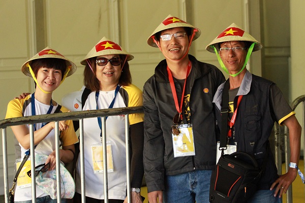 CĐV Lê Phương Trường dán Tem của BTC lên thành xe, LH - Gold Energy "an toàn" bước vào đường đua (thứ 2 từ trái qua) Mrs Tuyết không ngớt lời khen: "Đại học Lạc Hồng quá thành công..."
