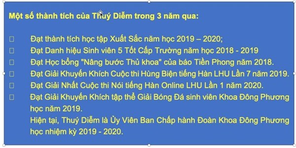 Đã 3 năm gắn bó với Trường Đại học Lạc Hồng, Thuý Diễm cho biết, bản thân càng tự hào và hãnh diện: “Em cảm nhận được sự ấm áp của ngôi nhà chung mang tên Trường Đại học Lạc Hồng, cũng như sự tốt đẹp của con người nơi đây, đặc biệt là các giảng viên của Trường. Họ thật sự là những người truyền lửa. Ngày nhập học, em đặt mục tiêu trở thành một thông dịch viên tiếng Hàn Quốc. Giờ đây, thầy cô đã đem lại cho em thêm một giấc mơ mới, rằng một ngày nào đó em cũng sẽ có thể đứng trên bục giảng và làm những điều tuyệt vời như thầy cô đã và đang làm”.