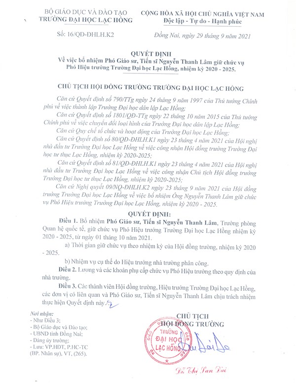 Các quyết định Bổ nhiệm Phó Hiệu trưởng Trường ĐH Lạc Hồng, nhiệm kỳ 2020 - 2025