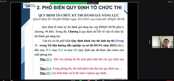 Sáng nay 22/03/2022, theo đúng tiến độ tổ chức kỳ thi, Đại học Quốc gia TP.HCM đã phối hợp với các đơn vị tổ chức tập huấn triển khai công tác chuẩn bị cho Kỳ thi đánh giá năng lực sắp tới. Sự kiện diễn ra bằng hình thức trực tuyến và đồng loạt tại các điểm Trường được phân công nhiệm vụ.