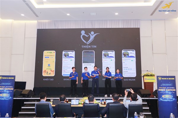 Bên cạnh những ý tưởng độc đáo về hệ sinh thái công nghệ, đội Thiện Tín LHU có màn tranh tài bùng nổ và tỏa sáng trên sân khấu, khuấy động cả khán phòng với sự “bứt phá” lột xác ngoạn mục, phong thái tự tin cùng những câu trả lời nhạy bén, trước sự cổ vũ nhiệt tình cùng tiếng reo hò của các bạn sinh viên với khẩu hiệu “ Đại học Lạc Hồng” càng tiếp thêm ý chí quyết tâm, vững tin và cháy hết mình trên sân khấu của các thành viên với phương châm “Quyết chiến - Quyết thắng”. Nhờ đó, Đội Thiện Tín LHU nhanh chóng đã chinh phục được Ban Giám khảo xuất sắc đạt giải Ba cuộc thi sáng tạo công nghệ Nam A Bank - Open banking Innovation (cuộc thi không có giải Nhất).