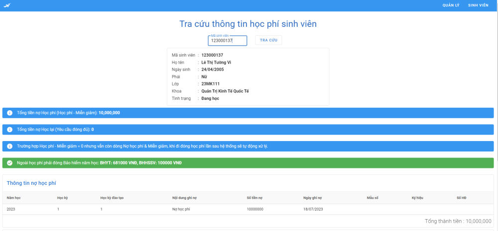 - Tân sinh viên nhập thông tin “Mã số sinh viên” và bấm tra cứu để xem thông tin học phí và lịch sử đóng học phí trong học kỳ.