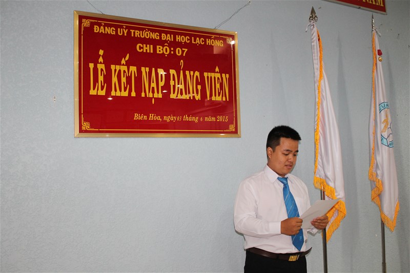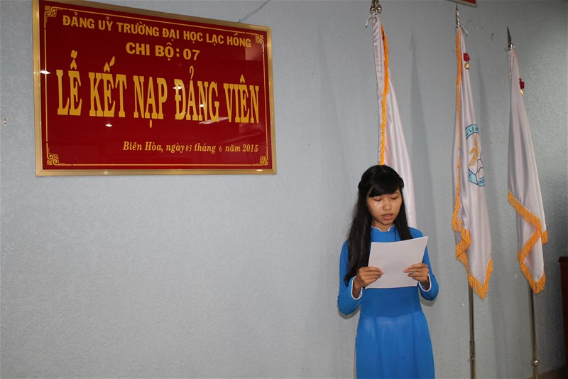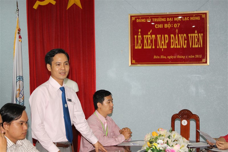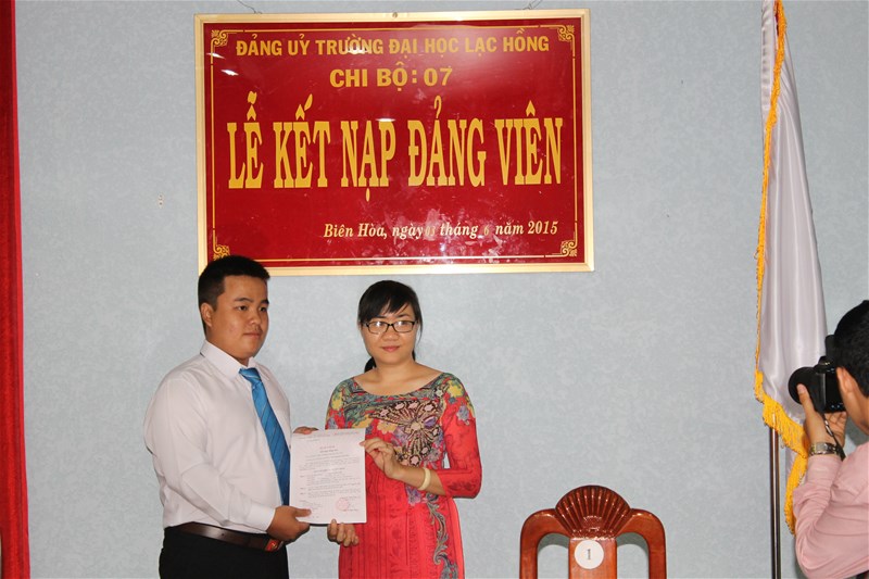 Căn cứ Quyết định của Đảng ủy khối các cơ quan tỉnh về việc kết nạp quần chúng Nguyễn Thị Hoài Vân và quần chúng Nguyễn Thế Hiển vào Đảng Cộng sản Việt Nam, được sự thống nhất của Ban Thường vụ Đảng ủy khối và Ban Thường vụ Đảng ủy trường, ngày 03 tháng 6 năm 2015 tại phòng họp CS1 trường Đại học Lạc Hồng, chi bộ 7 đã tiến hành tổ chức lễ kết nạp đảng viên cho quần chúng Nguyễn Thị Hoài Vân và quần chúng Nguyễn Thế Hiển vào Đảng Cộng sản Việt Nam; đến dự buổi lễ kết nạp có đồng chí Lê Sơn Quang – UV.BTV Đảng ủy trường cùng toàn thể đảng viên trong chi bộ 07.