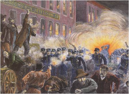 Ngày 3/5/1886, hơn 6 ngàn công nhân tổ chức bãi công mít tinh, biểu tình nhưng những người bãi công phản đối, bị cảnh sát đàn áp, 9 công nhân bị giết, 50 bị thương nặng, gây chấn động thành phố. Ngày 4/5/1886, một cuộc mít tinh khổng lồ diễn ra ở Quảng trường Hay- mác- két để phản kháng hành động của cảnh sát. Lấy cớ đó chính quyền mở cuộc khủng bố lớn, hơn 200 người chết và bị thương, nhà tù chật ních những người tham gia đấu tranh.