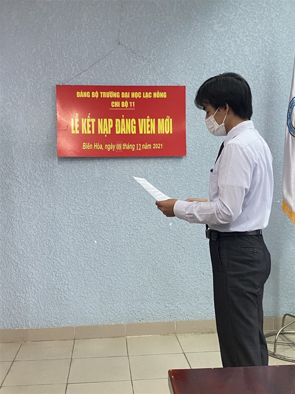 Được sự thống nhất của Ban thường vụ Đảng ủy khối, Đảng ủy trường ĐH Lạc Hồng, vào lúc 8h00 ngày 08 tháng 12 năm 2021 tại phòng họp cơ sở 1, Chi bộ 11 đã tiến hành tổ chức lễ kết nạp Đảng viên cho quần chúng Cao Văn Dư vào Đảng Cộng sản Việt Nam; Đến dự buổi lễ kết nạp có Đ/c Nguyễn Trùng Phương – Bí thư Đảng ủy trường cùng toàn thể Đảng viên trong Chi bộ.