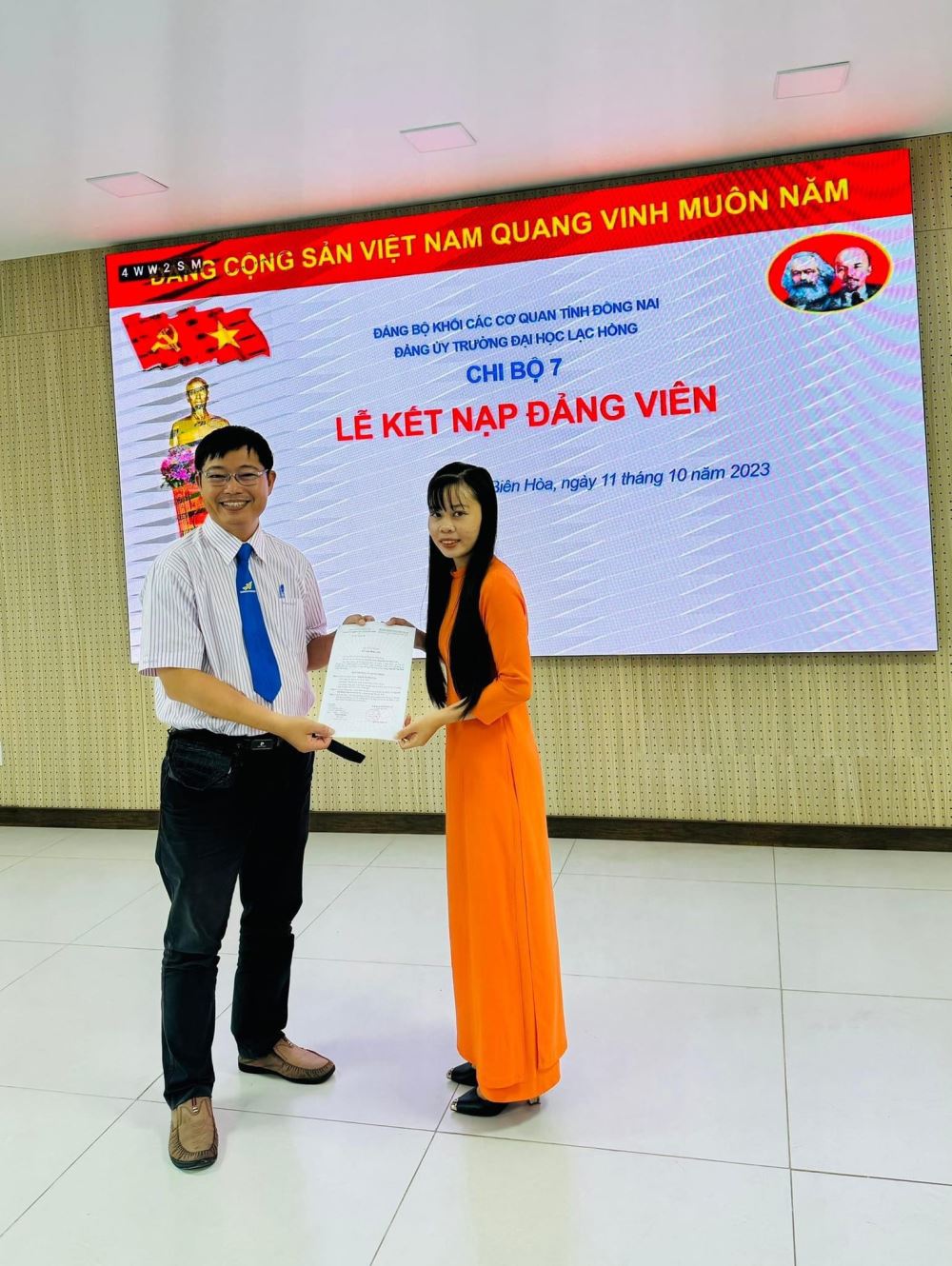 Được sự đồng ý của Đảng ủy khối các cơ quan tỉnh Đồng Nai và Ban Thường vụ Đảng ủy trường; Sáng ngày 11/10/2023 tại phòng họp cơ sở 1, Chi bộ 7 đã long trọng tổ chức Lễ kết nạp đảng viên cho quần chúng Nguyễn Thị Huệ Uyên vào Đảng Cộng sản Việt Nam.