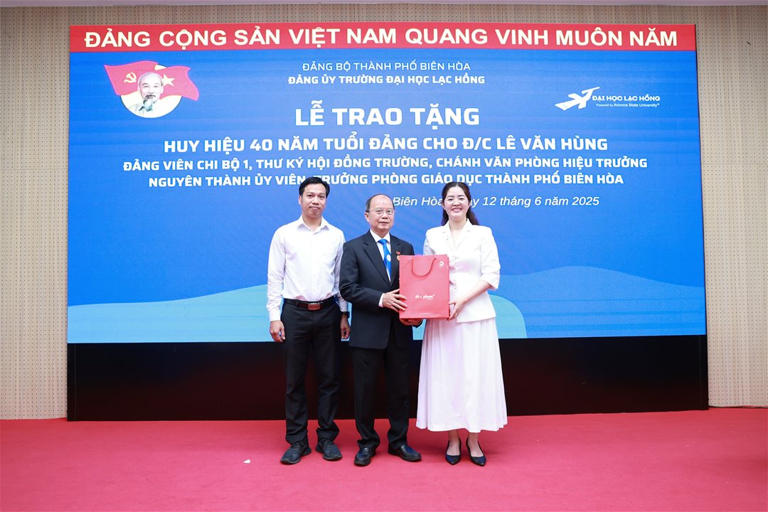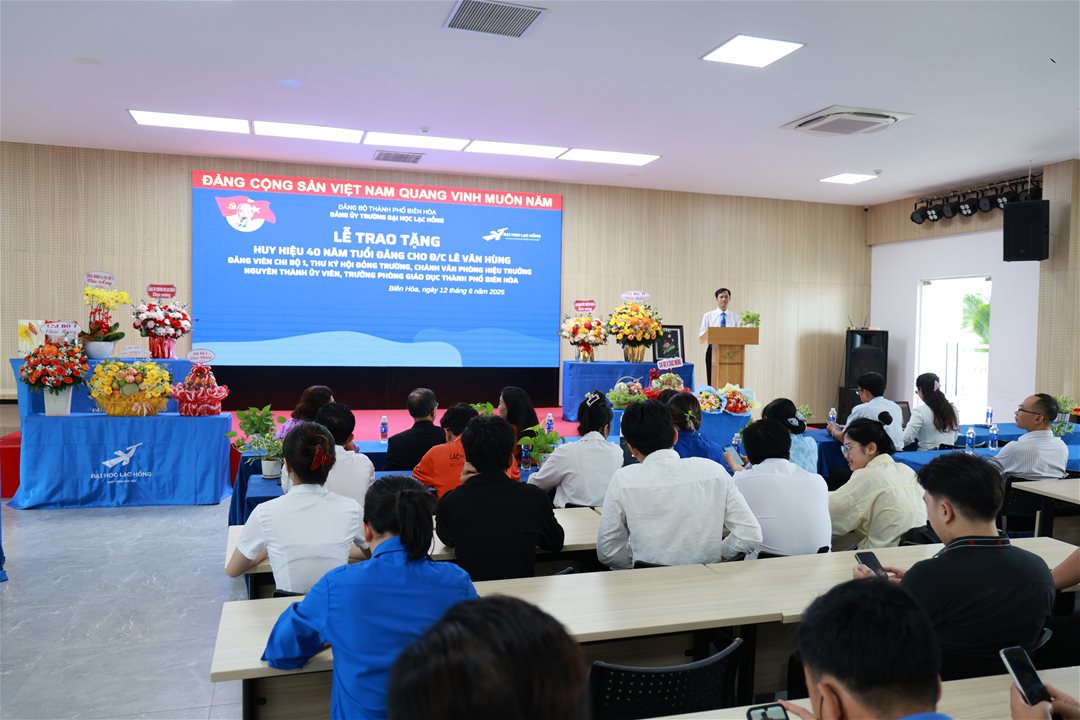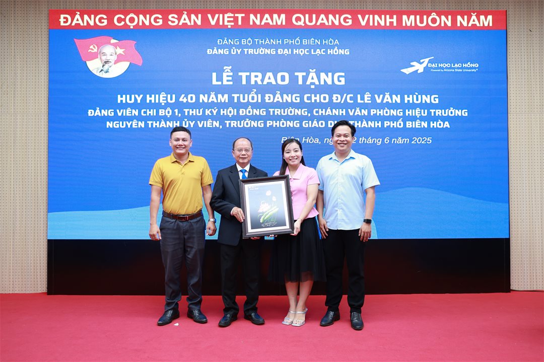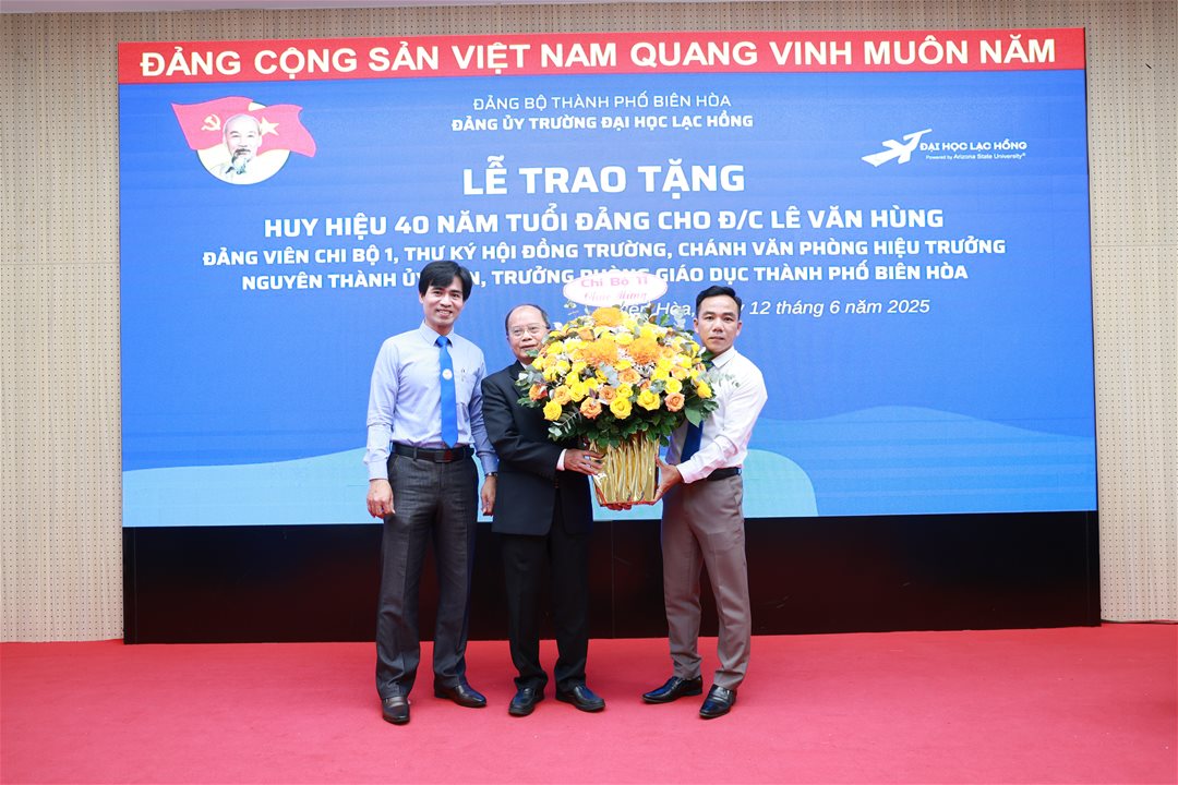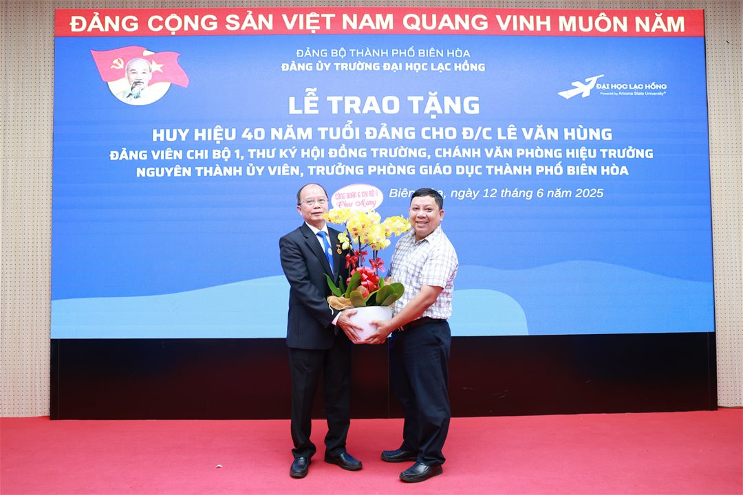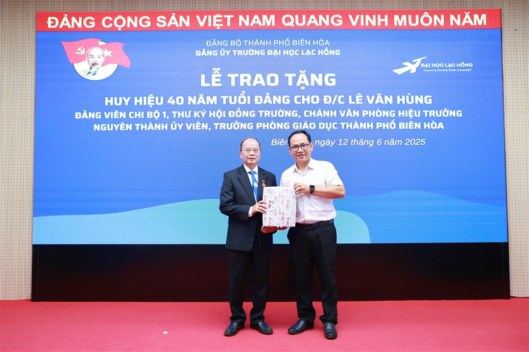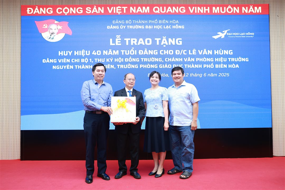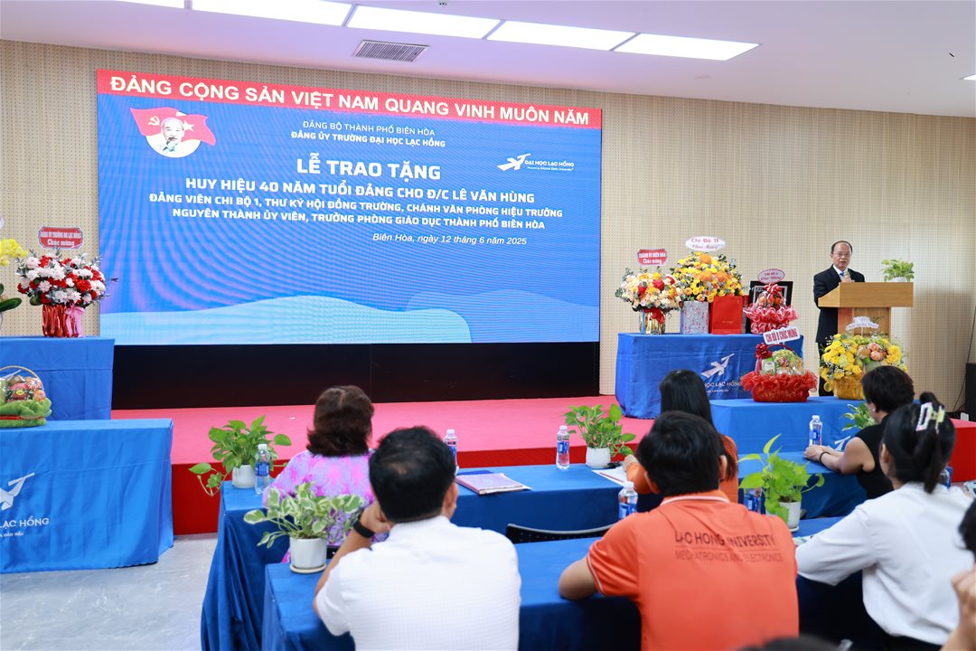Sáng ngày 12/6/2025, tại Hội trường A301, Cơ sở 1, Trường Đại học Lạc Hồng, Đảng ủy long trọng tổ chức Lễ trao tặng Huy hiệu 40 năm tuổi Đảng cho đồng chí Lê Văn Hùng – đảng viên Chi bộ 1, Thư ký Hội đồng trường, Chánh Văn phòng Hiệu trưởng; nguyên là Thành ủy viên, Trưởng phòng Giáo dục thành phố Biên Hòa.