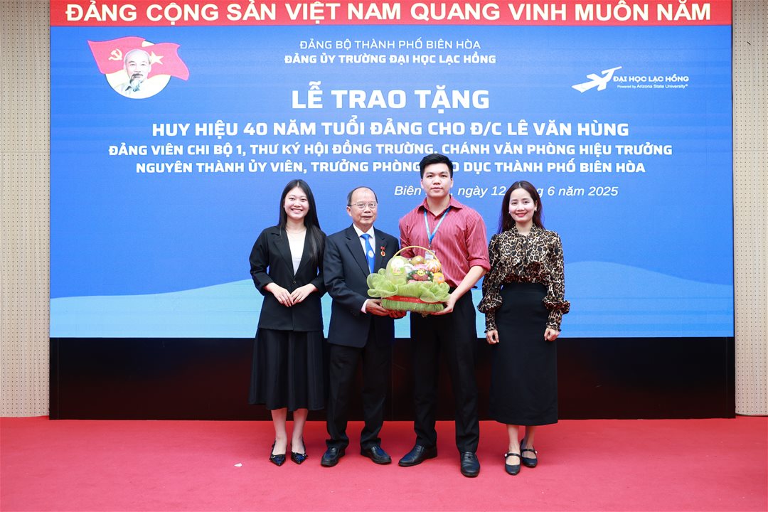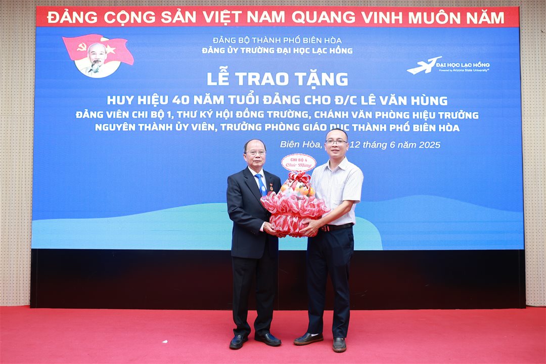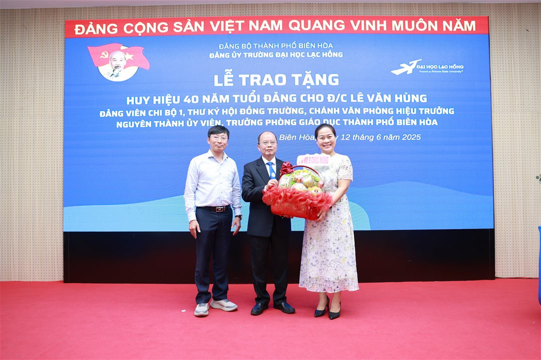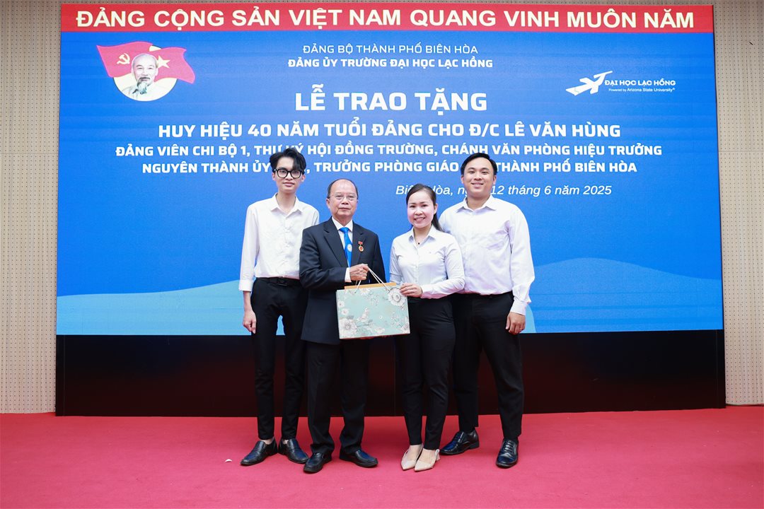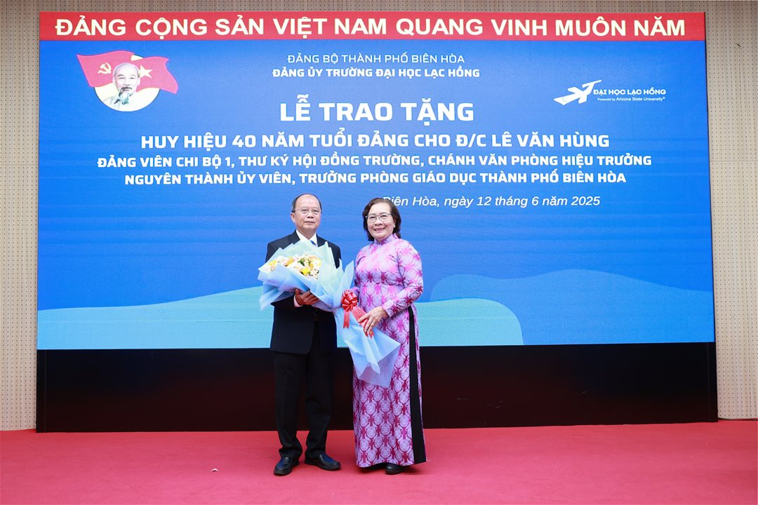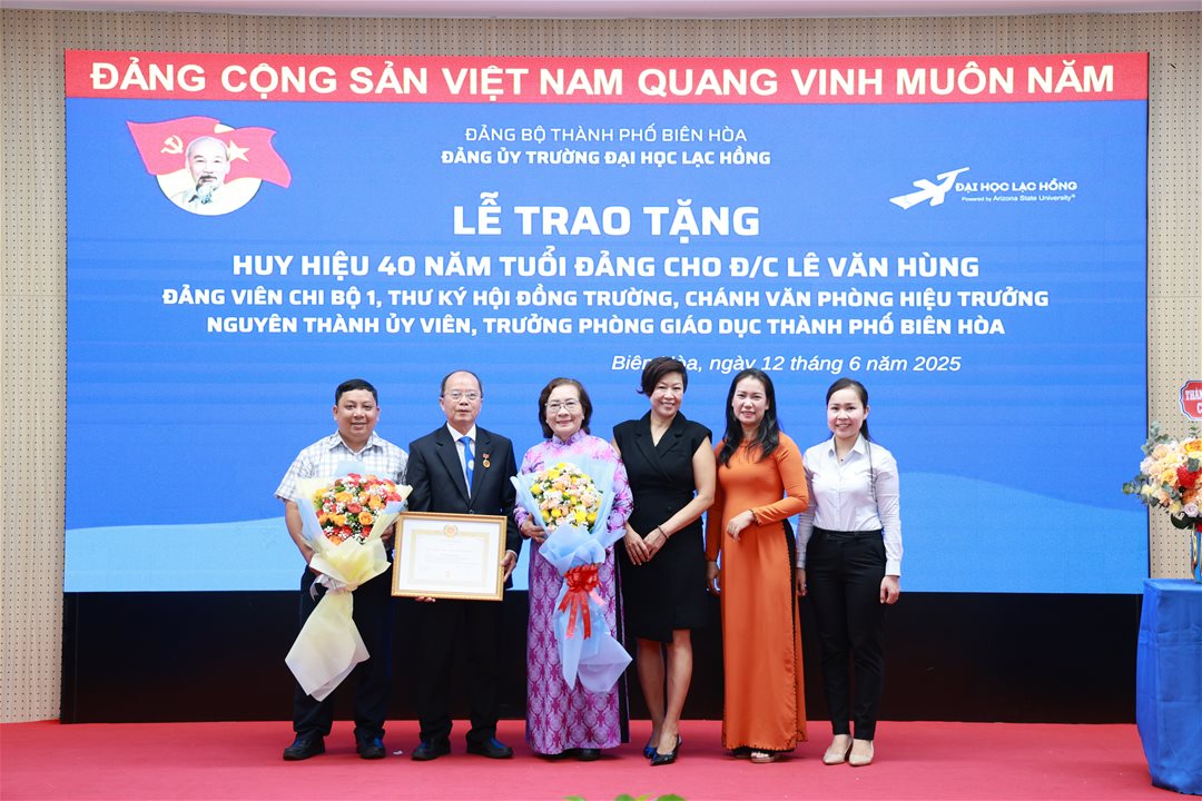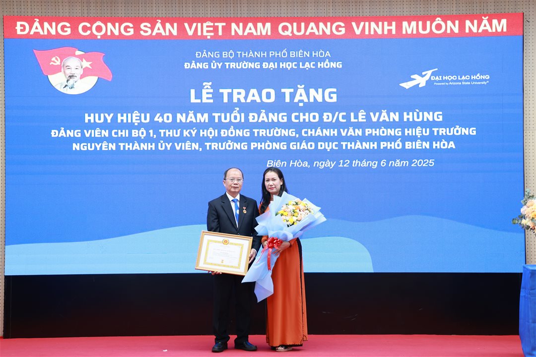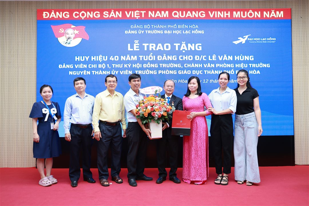 Sáng ngày 12/6/2025, tại Hội trường A301, Cơ sở 1, Trường Đại học Lạc Hồng, Đảng ủy long trọng tổ chức Lễ trao tặng Huy hiệu 40 năm tuổi Đảng cho đồng chí Lê Văn Hùng – đảng viên Chi bộ 1, Thư ký Hội đồng trường, Chánh Văn phòng Hiệu trưởng; nguyên là Thành ủy viên, Trưởng phòng Giáo dục thành phố Biên Hòa.