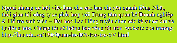 Nhằm tạo cơ hội việc làm cho các bạn sinh viên chuẩn bị ra trường, cũng như tư vấn hướng nghiệp đáp ứng nhu cầu nhân sự cho công ty. Đến trường Đại học Lạc Hồng lần này công ty Esuhai cần tuyển: 05 nhân viên văn phòng tiếng Nhật; 03 giáo viên, chuyên viên đào tạo tại Đồng Nai và 02 thông dịch viên.