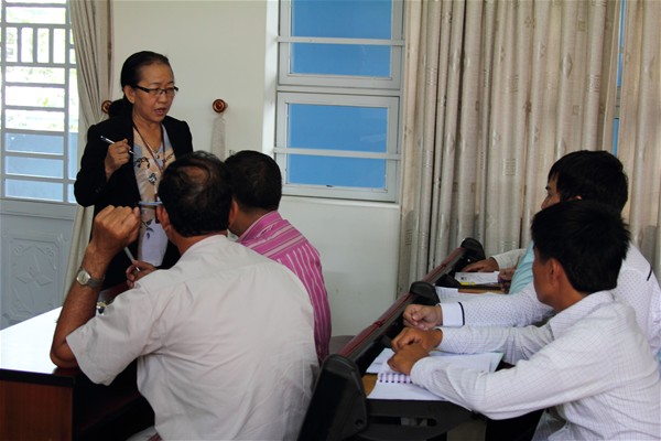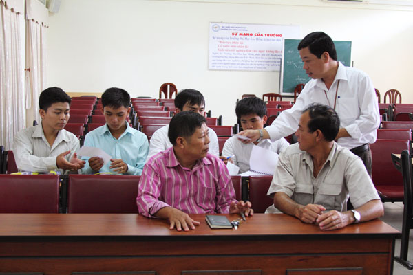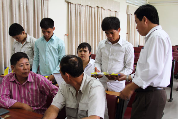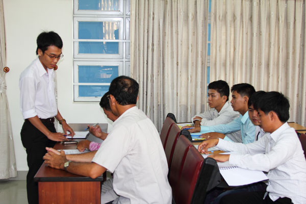 Để tạo thuận lợi cho các em trong quá trình học tập, Nhà trường đã bố trí 5 em học cùng một lớp giúp các em có thể cùng trao đổi, nghiên cứu. Trong buổi làm việc chiều hôm nay, thầy Lưu Ngọc Cương – Phó trưởng phòng Đào tạo đã giới thiệu chương trình học của các em tại khoa Quản trị Kinh tế Quốc tế, hướng dẫn các em cách sử dụng hệ thống dịch vụ tại trường để xem lớp học, lịch học… Tuy các em là những người Việt tại Campuchia nhưng do sinh ra và lớn lên tại Campuchia nên khả năng giao tiếp bằng tiếng Việt còn gặp nhiều khó khăn. Thầy Lưu Ngọc Cương đã tỉ mỉ hướng dẫn từng bản đồ, cách xem lớp học, môn học như thế nào để các em nắm rõ.
