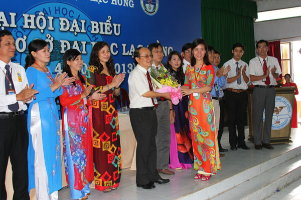 BCH Công đoàn nhiệm kỳ mới ra mắt đại hội và nhận bó hoa chúc mừng từ đại diện cán bộ giảng viên trường Đại học Lạc Hồng