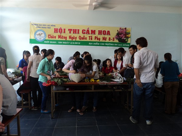 Vào lúc 10 giờ ngày 03 tháng 03 năm 2012, tại phòng D206, Đoàn - Hội sinh viên Khoa Ngoại Ngữ đã tổ chức thành công cuộc thi cắm hoa chào mừng ngày Quốc tế phụ nữ 8/3. Cuộc thi thu hút sự tham gia đông đảo của 10 đội thi đến từ các chi đoàn trong khoa với không khí vui tươi và hào hứng. Mỗi đội đều mang đến cho cuộc thi những tác phẩm hoa đầy màu sắc rực rỡ với nhiều chủ đề hấp dẫn. Ban tổ chức đã trao 1 giải nhất, 1 giải nhì, 1 giải ba, 2 giải khuyến khích cho 5 đội xuất sắc lọt vào vòng trong với phần thuyết trình đầy thuyết phục; đồng thời trao 5 giải phong cách cho các đội còn lại nhằm động viên tinh thần nhiệt tình tham gia các phong trào do Đoàn khoa phát động. Sau đây là một số hình ảnh của cuộc thi: