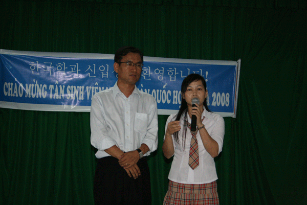 Trong buổi lễ các sinh viên khóa trước đã có những chia sẻ về kinh nghiệm học tiếng Hàn, kinh nghiệm thực tập và kỹ năng giao tiếp ở Công ty…với các tân sinh viên. Thầy Lee Seon Jae cũng chào đón sinh viên khóa mới bằng những lời căn dặn chân tình của một người thầy Hàn Quốc. Ấn tượng và sôi nổi hơn cả là phần chào đón các tân binh của từng anh chị lớp trên. Những bài hát tiếng Hàn, những điệu nhảy dễ thương, nhí nhảnh cùng những lời chúc mừng, chào đón thành viên mới của ngôi nhà Đông Phương nói chung, ngành Hàn Quốc học nói riêng đã mang lại niềm vui và sự hứng thú cho sinh viên khóa mới. Thay mặt Ban lãnh đạo Khoa Đông Phương Ths. Bùi Thị Thu Thủy phát biểu chào mừng tân sinh viên và dặn dò sinh viên những điều cần thiết khi bước chân vào giảng đường Đại học.