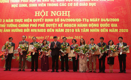 PGS.TS Trần Quang Quý - Thứ trưởng Bộ GD-ĐT lên tặng Bằng khen cho tập thể và các cá nhân có thành tích trong công tác phòng chống HIV/AIDS.