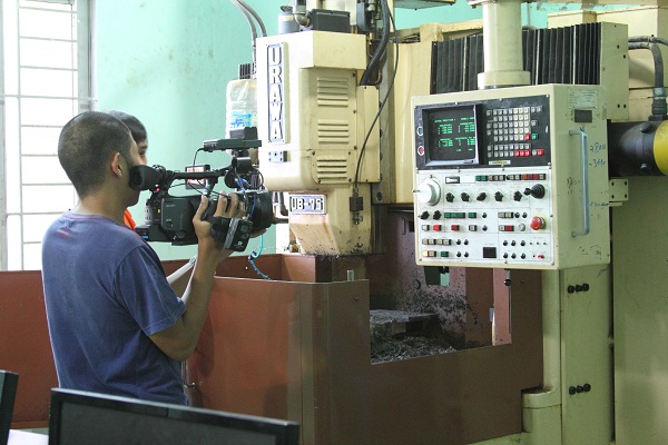 Phóng viên Đài NHK- Nhật Bản đang tác nghiệp tại xưởng Robot (CS1-ĐHLH)...
