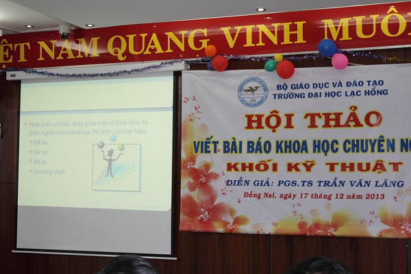 (NCKH – 19/12/2013) Hướng đến mục tiêu phát triển hoạt động nghiên cứu khoa học và đặc biệt là hoạt động viết bài báo khoa học tại Đại học Lạc Hồng. Vừa qua, 17/12/2013 Phòng NCKH tổ chức Hội thảo “Viết bài báo khoa học chuyên ngành – Khối Kỹ thuật” tại hội phòng B.203, dưới sự tham dự của ThS.Lâm Thành Hiển – Phó Hiệu trưởng nhà trường; PGS.TS Trần Văn Lăng – Trưởng Khoa CNTT; TS.Nguyễn Vũ Quỳnh – Trưởng Khoa Cơ điện Điện tử - Trưởng phòng NCKH; cùng quý thầy cô là lãnh đạo và giảng viên của các Khoa..