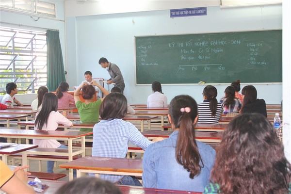 Sáng nay, sinh viên đã thi môn cơ sở ngành trước, với thời gian 180 phút. Theo tiến độ, đúng 6:30 đồng loạt các hội đồng đều tổ chức sinh hoạt. Trưởng điểm thi phổ biến các quy định và nhắc nhở cán bộ phòng thi làm việc đúng hướng dẫn.