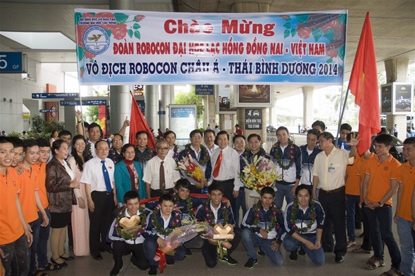 (ĐHLH - 27/08/2014) Sau chiến thắng vinh quang tại đấu trường quốc tế - Sáng tạo Robocon Châu Á Thái Bình Dương 2014 diễn ra ở Pune - Ấn độ, 9:15 đoàn Robocon Lạc Hồng - Đồng Nai - Việt Nam đã về tới Sân bay Tân Sơn Nhất (TP.HCM). Ra đón đoàn tại sân bay, ngoài gia đình, bạn bè của các thành viên đội tuyển, còn có Lãnh đạo các Sở, Ngành của Tỉnh Đồng Nai và Ban Lãnh đạo trường Đại học Lạc Hồng.
