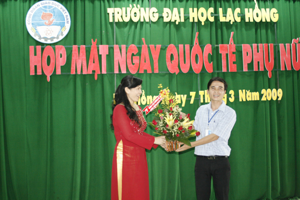 Cô Hồ Thị Hải Yến đại diện nhận lẵng hoa chúc mừng của Đảng ủy trường ĐH Lạc Hồng...