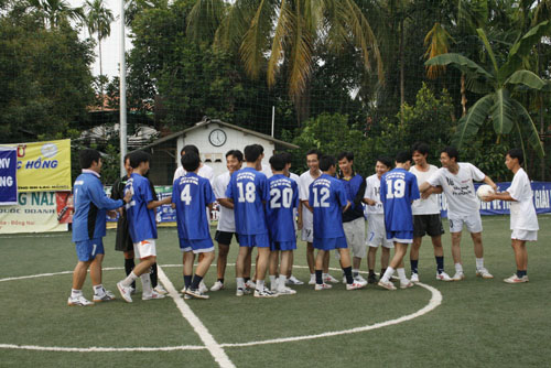 Các cầu thủ khoa Kinh tế bắt tay các cầu thủ khoa Kỹ thuật trước khi "vào trận"