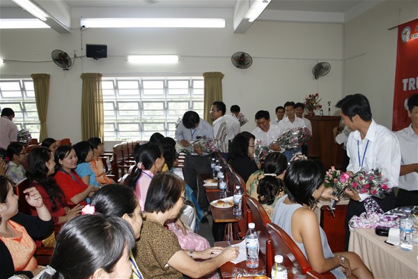 Các nhân viên nam tặng hoa cho chị em phụ nữ trong buổi họp mặt