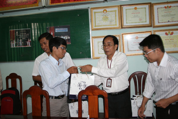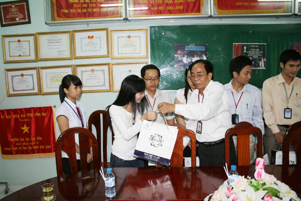 Tiến sĩ Trần Hành tặng quà lưu niệm cho các học viên du học năm nay.