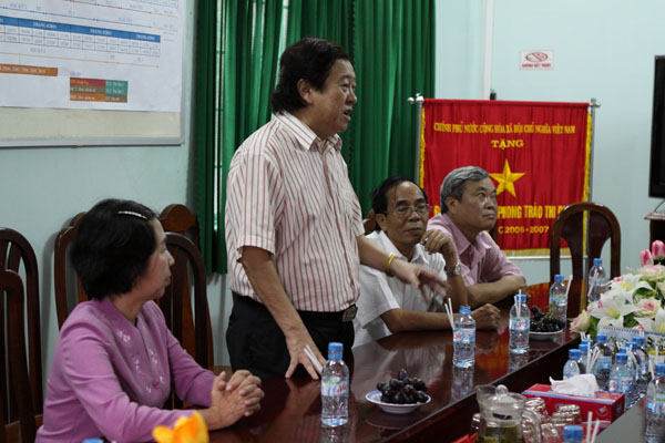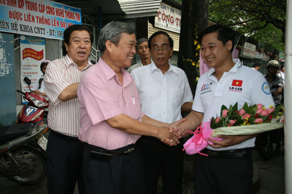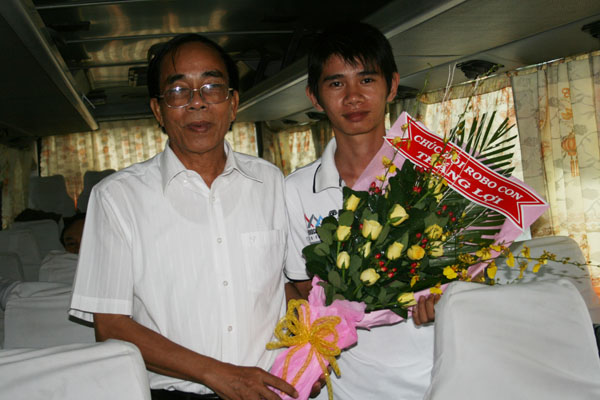 Tiến sĩ Trần Hành và bó hoa chúc thắng lợi cho đoàn thi đấu