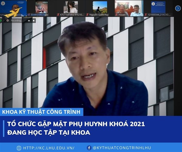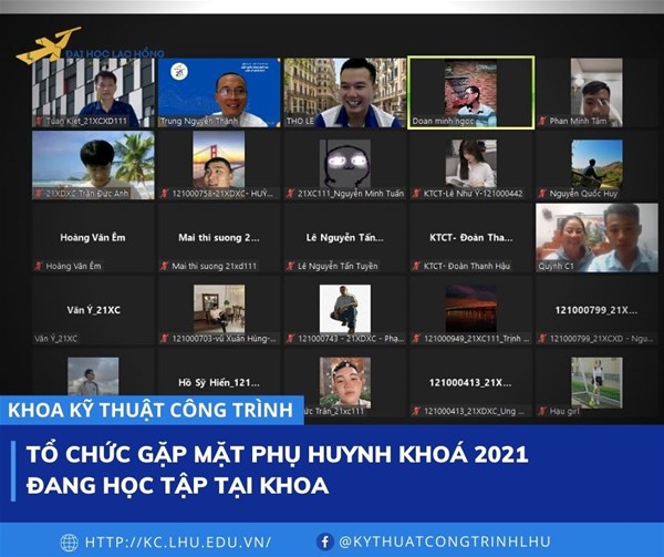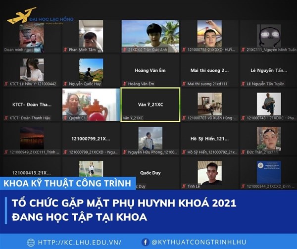 Theo chương trình hoạt động, kết thúc mỗi năm học Khoa tổ chức gặp mặt, đối thoại với phụ huynh khoá 2021 đang tham gia học tại Khoa Kỹ thuật công trình (KTCT). Với mục đích là truyền tải, thông tin nhanh nhất tinh hình của sinh viên tham gia học và những hoạt động giảng dạy, phát triển của Khoa trong năm học vừa qua đến tất cả phụ huynh có con em đang học tại Khoa KTCT và tại Trường ĐH Lạc Hồng nói chung vào tuần đầu tháng 7/2022, với hình thức trực tuyến.